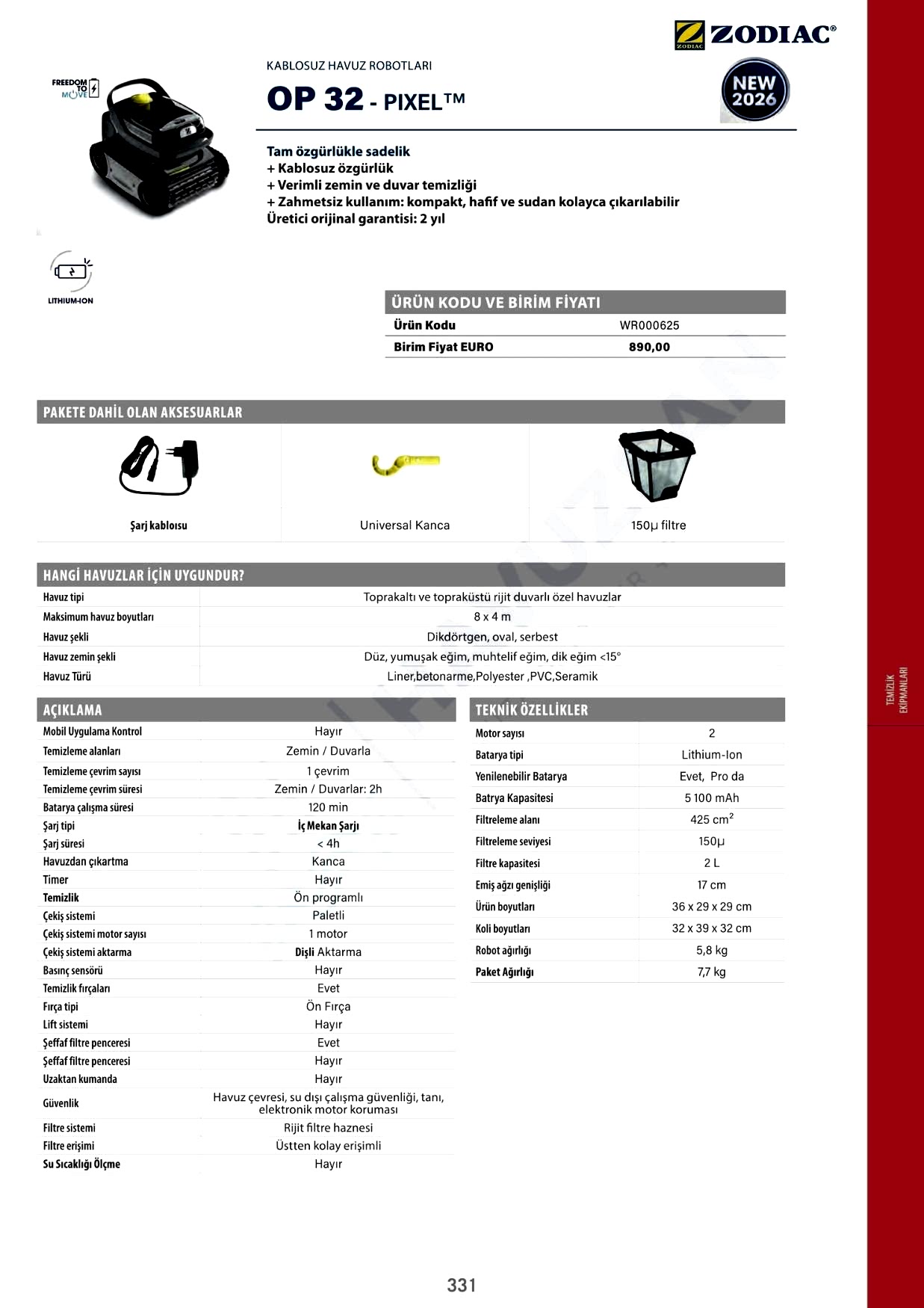 OP 32 Pixel Havuz Robotu Teknik Özellikleri
