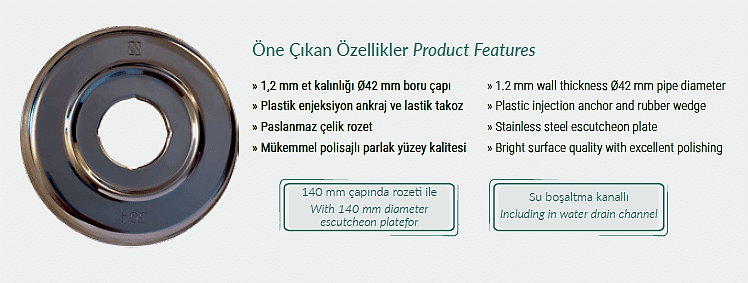Merdiven basamakları kaymaz yüzey formu ile güvenli tutuş sağlar. Plastik yan parçalar paslanmaz çelik basamaklara vidalı sistemle sabitlenmiştir. Montajda kullanılan plastik enjeksiyon ankraj ve lastik takoz sistemi zemine sağlam bağlantı oluşturur. 140 mm çapında paslanmaz rozet kapak ve su boşaltma kanalı detayı hem estetik hem fonksiyonel kullanım sağlar.