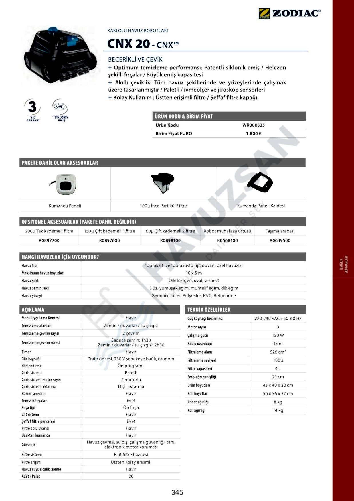 Zodiac CNX 20 Havuz Robotu Teknik Özellikleri
